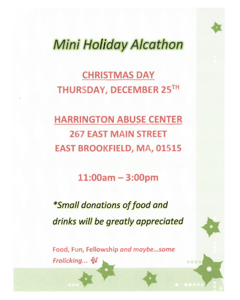 Harrington Abuse Center mini-Alcathon, 11am-3pm 267 East Main Street, East Brookfield. Food donations welcome.